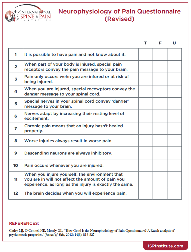 This questionnaire can be administered quickly during the intake process, and allows clinicians to easily get a broad overview of the patient’s beliefs regarding how and why they are in pain. This will then subsequently tailor your education approach to fit their individual needs.
