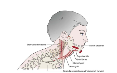 The suboccipital musculature becomes tight, contributing to upper cervical hypomobility and causing referred pain to the face and head. Increased neck pain and tension leads to increased grinding. Increased activation of the SCM, which occurs with FHP, causes increased activation of the masseters.
