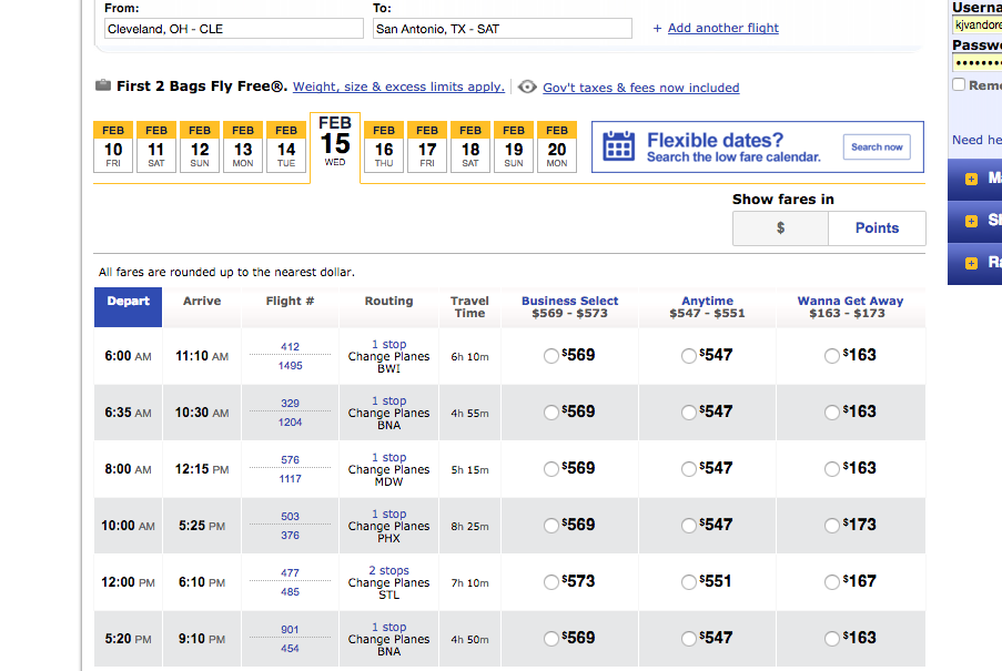 The core programming for CSM runs from February 15-18, 2017. Let's say I want to fly into San Antonio on February 15, and depart on February 19. I first run a quick search on Southwest, one of my favorite airlines: