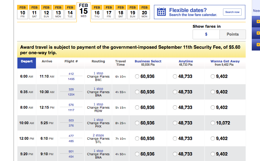 As you can see, a one way flight starts at $163 for my date. But you can also purchase this ticket with around 10,000 Rapid Rewards points, by clicking on the option to show fares in points: