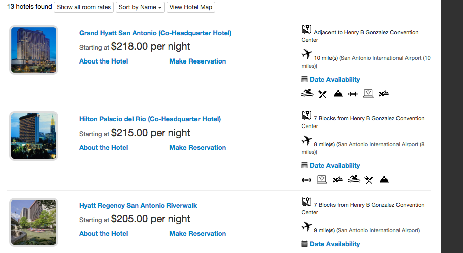 Further inspection reveals a few good possibilities. While most of the hotels immediately adjacent to the conference center are sold out and probably primarily reserved through the room blocks by APTA, there are several options within a mile of the conference and a 15-20 minute walk.