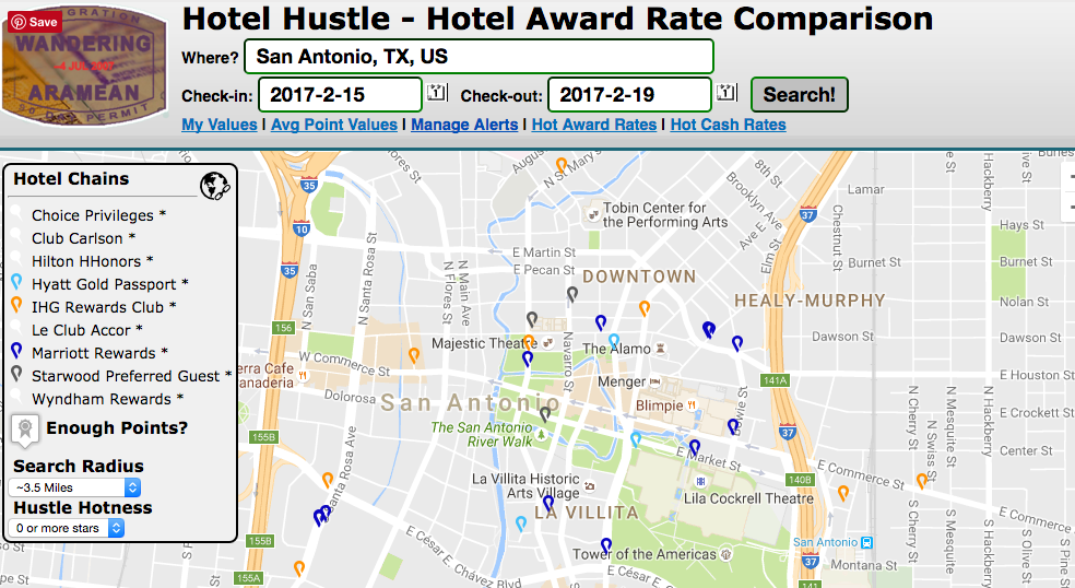 Using a site like Hotelhustle.com, I can check which hotels in the area can be reserved with loyalty points. The website also shows me whether these hotels have any availability for my dates. I have selected the option to view hotels in the Hyatt, Marriott, Starwood, and IHG brands, as I typically find good value with those points, and they have easy options to earn those points as I will show below: